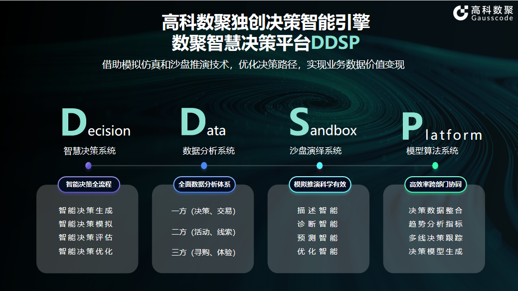 面对市场的高复杂度、高不确定性、高成本和高风险等企业决策背景,J9国际站 J9凭借大决策应用概念,成功在国内推出首个数据驱动决策(Data to Decision)的“大决策”平台——J9国际站 J9智慧决策平台 DDSP (Decision Data Sandbox Platform)。